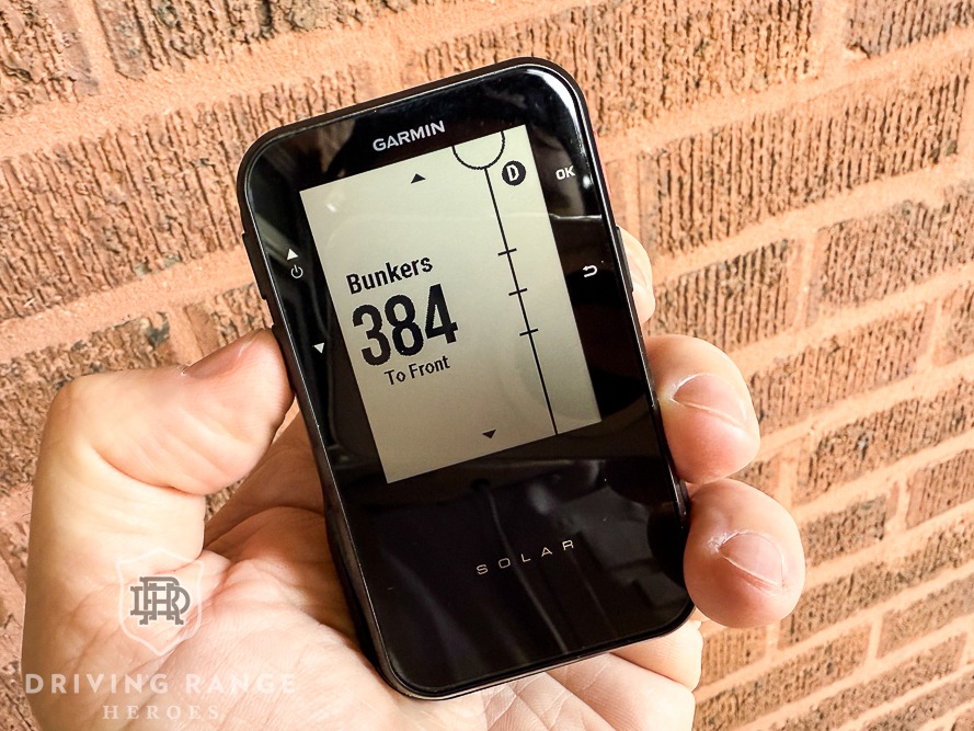 Three big things come to mind as standout features of the Garmin Approach G20 Solar handheld. One, it’s so easy to see! A big gripe I have had is that on-course accessories easily get washed out in sunny conditions. The Approach G20 uses big, bold, high contrast fonts. While we’re not getting full-color displays and diagrams of courses, that’s not entirely necessary here. It does take a minute to learn the symbols and markings here, but it’s really not that hard.